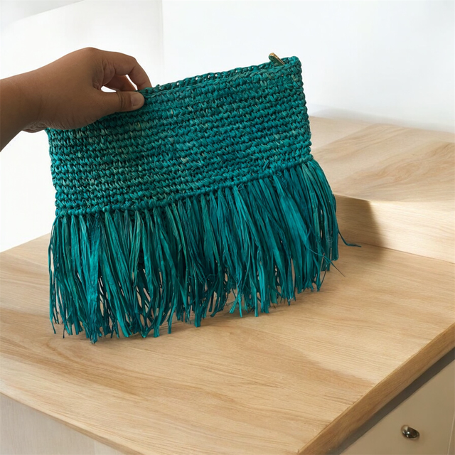 La pochette à franges est une pochette au crochet fabriquée à partir de fibres naturelles de raphia. Elle est doublée de tissu et dotée d'une fermeture à glissière. Les matériaux utilisés sont issus de sources éthiques et durables.